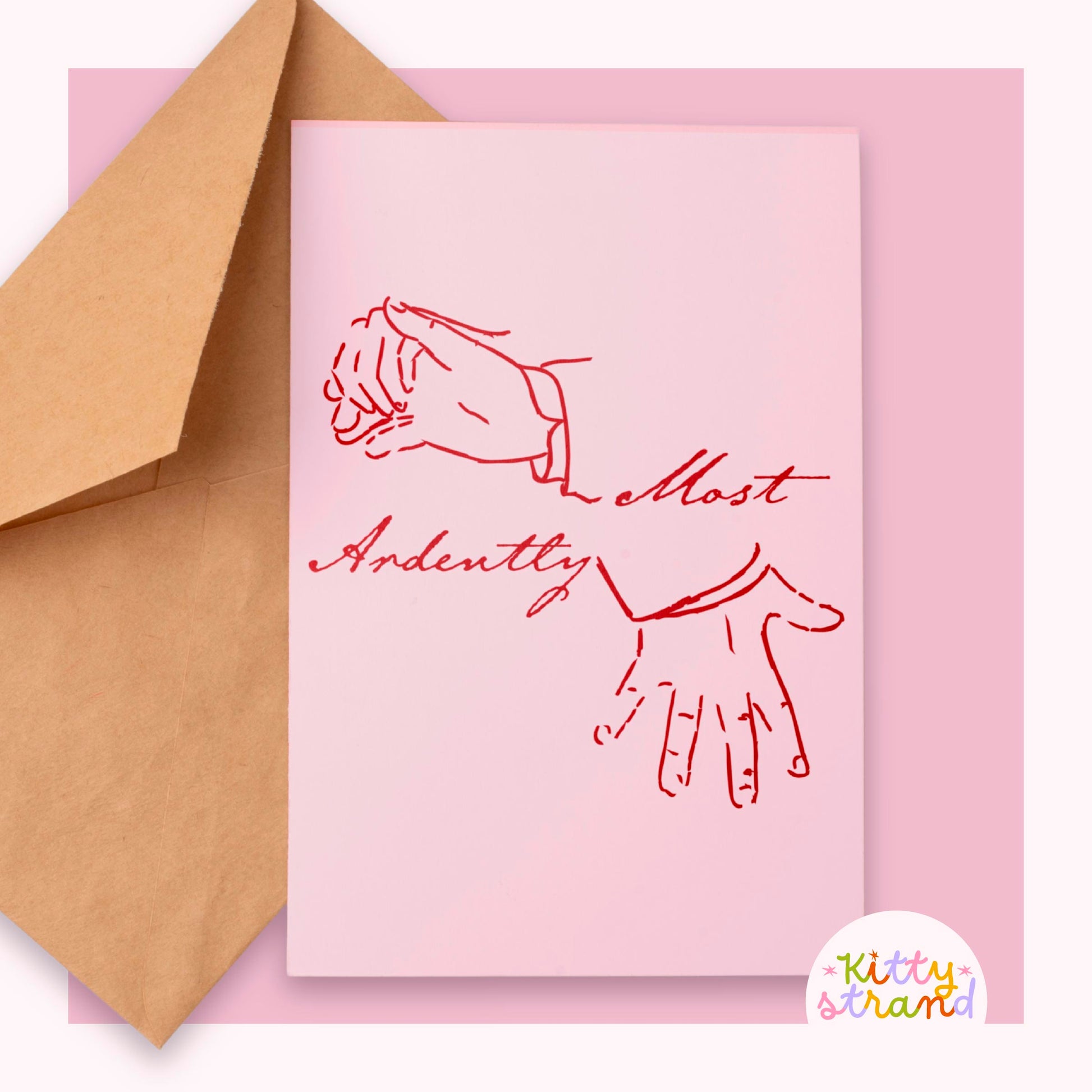 A soft pink background with a playful line-art illustration of Mr Darcy & Elizabeth Bennet's hands. Cursive typography reads Most Ardently in reference to the classic confession of love in Jane Austen's most beloved romance. A playful, classic design for the person you love most!